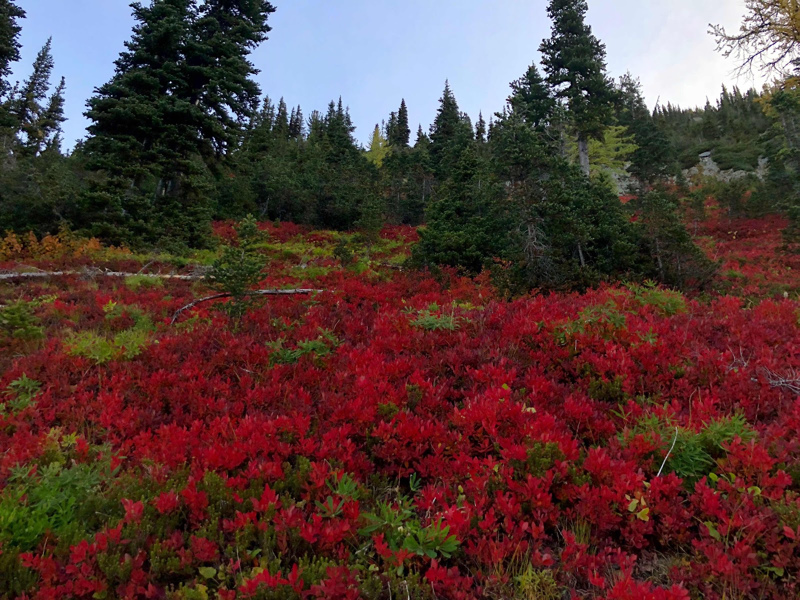 It was a success! Although still feeling crappy the next day, the cold was much improved and I felt like I had a little more energy. The trail was as beautiful as ever, all the colours standing out brightly in the sun and against a blue sky. I had a hard time focusing on the trail ahead of me as stunning views kept emerging in every direction. The mountains were vast and glacier covered. I took a long lunch break nestled into some bright red bushes among yellow larches, and spent it watching curious pheasants hopping about in the bushes.
